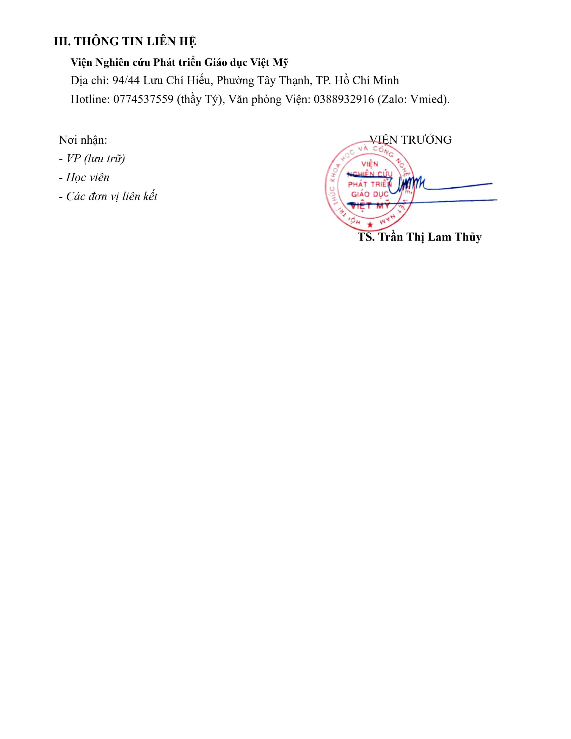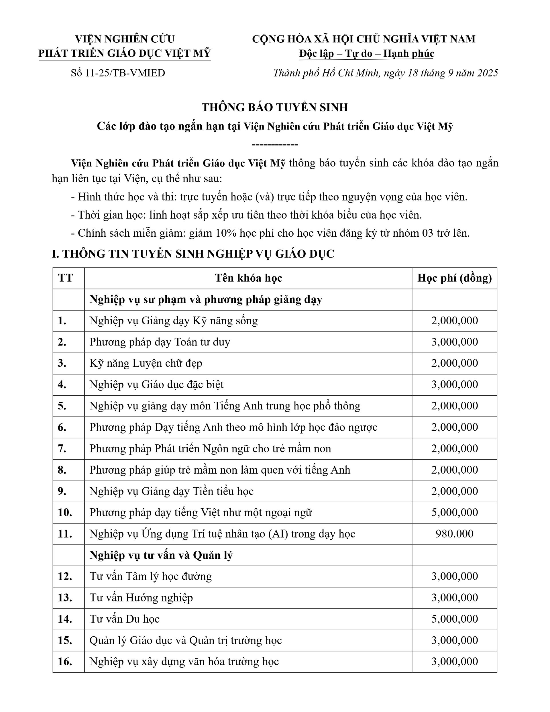 Viện Nghiên cứu Phát triển Giáo dục Việt Mỹ thông báo tuyển sinh các khóa đào tạo ngắn hạn liên tục tại Viện, cụ thể như sau: